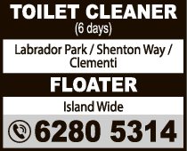 Hiring Public Areas Cleaner in Guest Worker Dormitory near Taman Jurong 7am-3pm/ 11pm-7am S'poreans only. Tel 87685033 (No agt pls.)