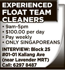 5-day: Salary up to $2400 Cleaners / School Team Leaders / Compound Cleaners @ Sengkang / Punggol / Hougang / Tampines / Bedok area. 9423 9833 / 9247 8476 / 9661 6624 / 9489 9241 / 8131 7712. Singaporean Only.