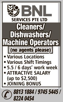 We are hiring General Cleaners@ Serangoon North – 8am to8pm, 8pm to 8am, 6 days,@ Raffles Place – 7am to 4pm,5.5 days@ Church Street - 4pm to8pm, 5 days@ One Raffles Link – 7am – 7pm, 5.5 days, 7am – 4pm, 5.5 days, 4pm – 9pm, 5days Washroom Cleaners@ Dhoby Ghaut – 7am to 7pm, 5.5 days Singaporean OnlyBasic salary: From $1,910 & Joining Bonus 81231356/ 91121994