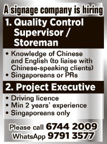 Supervisor needed, $3000, 6 days, near Bartley Road. S'porean. Call 9025 0624