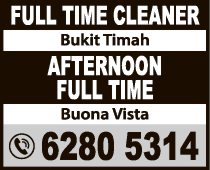 Cleaner (Choa Chu Kang – Children’s Society).Salary approx. $2,100, toilet cleaning required, good benefits, 12 days annual leave. Singapore Citizens only. 87685033 / 89767501 (No agents)